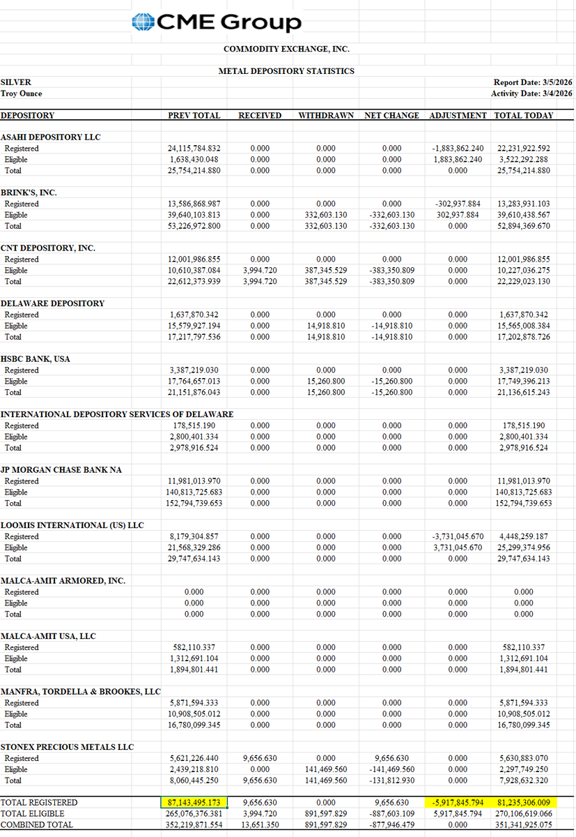5.9 million silver ounces (6.7%) moved out of the registered category which backs the silver futures contract.