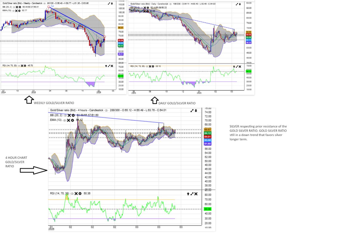 Silver respecting declining resistance of the gold silver ratio. Gold Silver Ratio still in a down trend that favors silver longer term.