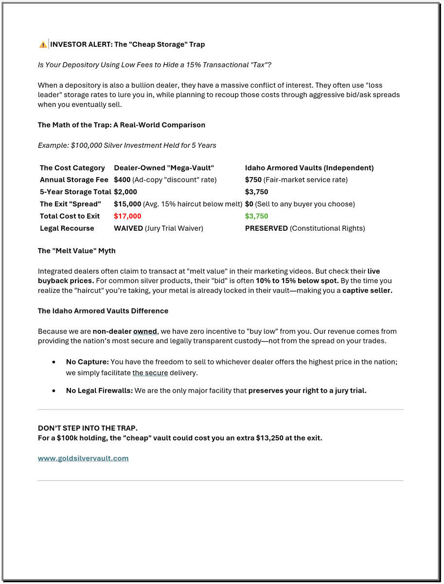 - Independent, conflict-free precious metals storage with no dealer ownership or forced liquidation model.